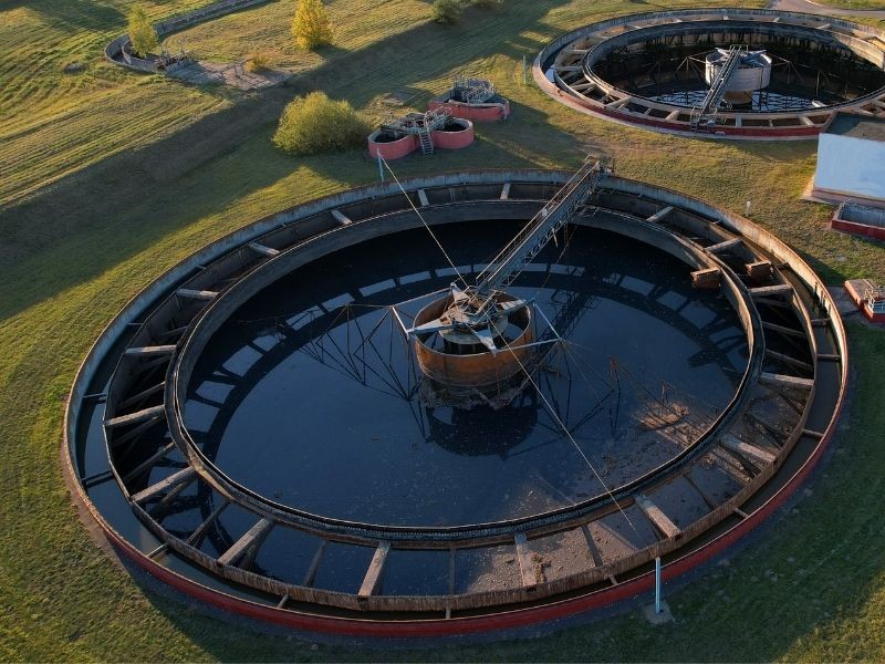 - Decantadores Primários e Secundários de uma Estação de Tratamento de Efluentes (ETE): Tanques nos quais ocorre a sedimentação de sólidos, separando os flocos biológicos formados no tratamento biológico.